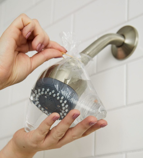 - 샤워기 헤드를 비닐팩 안에 담고 고무줄로 단단히 고정합니다.